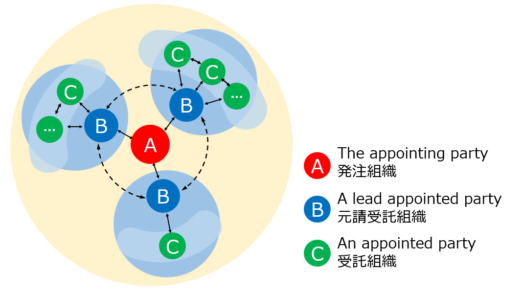 発注組織や元請受託組織という表現を用いると、契約関係を示すように捉えられがちですが、先に述べたように、契約関係そのものを示すわけではありません。ISO19650では、情報を要求し受領する組織(Party)と情報を作成し納品する組織(Party)といった関係として整理されています。